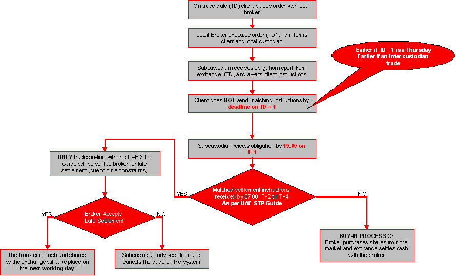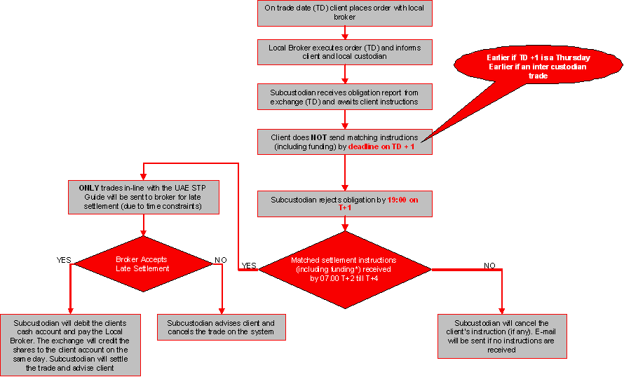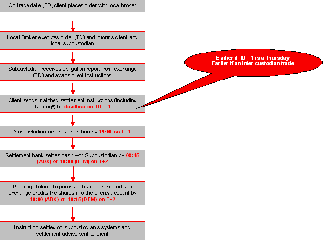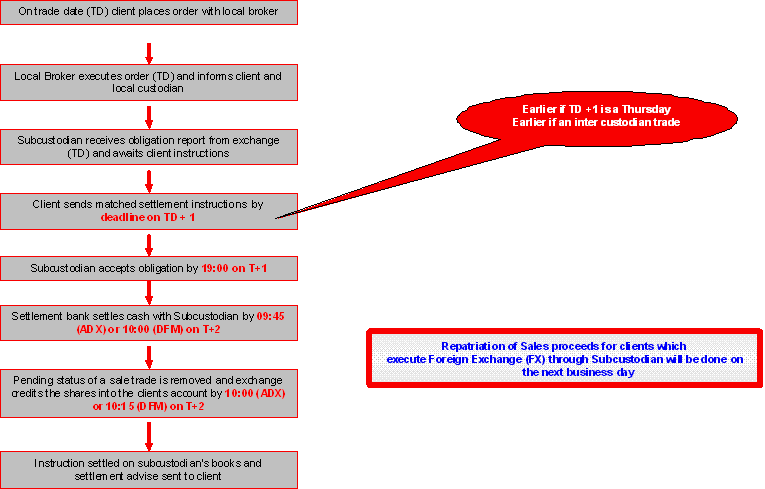 *Please note that market charges/fees may apply to late settlement post T+2 and will be deducted from the sales proceeds by the market. The following is a broad description of how settlement takes place: The Abu Dhabi Securities Exchange (ADX) implemented Delivery versus Payment (DvP) settlement mechanism from May 29, 2011. The need to set up and operate with a dual account structure is still a major concern to a number of international institutional investors and is incompatible with general emerging markets standards. International institutional investors often establish segregated custody and trading accounts in order to mitigate the risk from local brokers having unlimited access to the trading accounts. This results in the significant operational burdens of having to transfer shares from one account to the other prior to trade. Local brokers have 'execution access' to client's Agent Trading account, and brokers may sell assets without relevant instructions from clients. The DvP model seeks to address these issues by enabling local custodians to reject purchase and sale trades which clients do not recognise (or have not sent matching instructions for). With the DVP model implemented, the Sub-Custodians have better control & protection over client assets and especially with added feature of "Buyer Cash Compensation (BCC) - a measure provided by the markets whereby sellers assets are protected, if he irrevocably rejects a sell trade, which they do not recognise & treat it as a bad trade. The Abu Dhabi Securities Exchange (ADX) has issued updated operational guidelines on their DvP model. Details of the settlement flow - (as per RBC Investor Services' subcustodian) for foreign institutional investors (FIIs) are provided as follows: 1. Direct / Turnaround purchase trade settlement - DFM / ADX obligation accepted by subcustodian